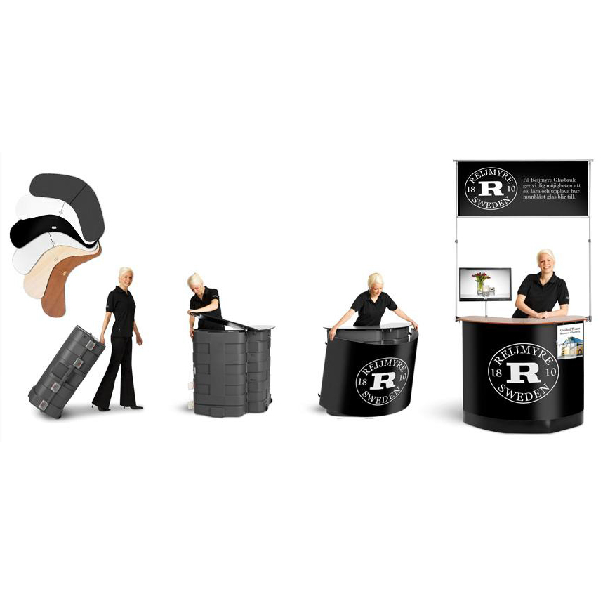 Für den Thekenaufbau bedarf es lediglich der Fixierung der passenden Thekenplatte. Die Theke bietet eine großzügige Oberfläche für Ihr Event. Innen mit herausnehmbaren Einlegeböden für die Ablage von Broschüren, Demoprodukten und Getränke.