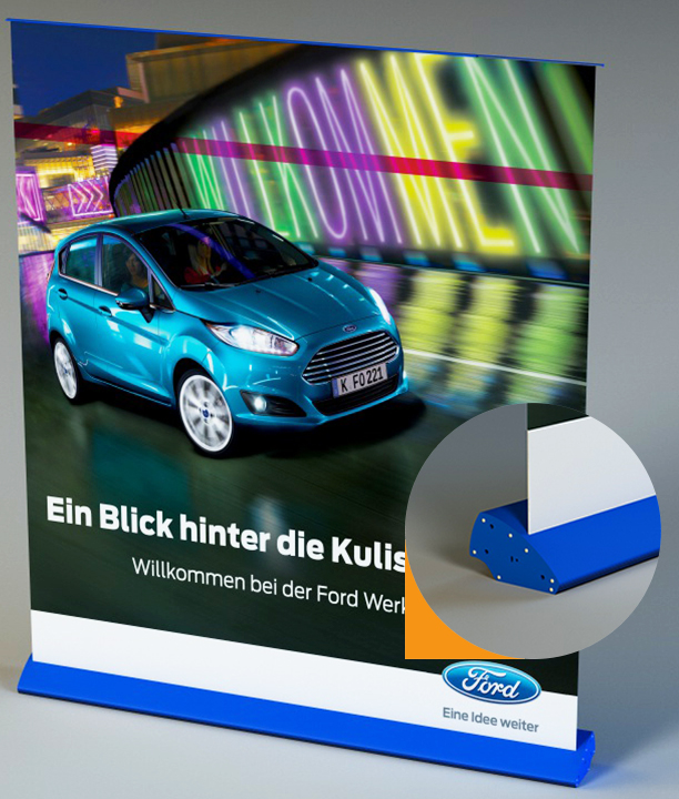 Das RO.03 / Neu XXL Rollup ist ein formschönes, stabiles und qualitativ hochwertiges Rollup. Es ist kein zusätzlicher Fuß notwendig. Das System ist in schwarz, weiß und silber erhältlich (pulverbeschichtet). Enthalten ist eine Transporttasche und ein brillianter 4-farb Druck auf UV beständiger, wetterfester Display-Spezial-Folie (480 gramm/qm). Gegen Aufpreis ist das System auch mit seitlichen Chromkappen lieferbar. Die Maße sind B 150/180/200/240/300/320 x H 225 cm. Optional erhältlich: Halogenstrahler für Rollup
